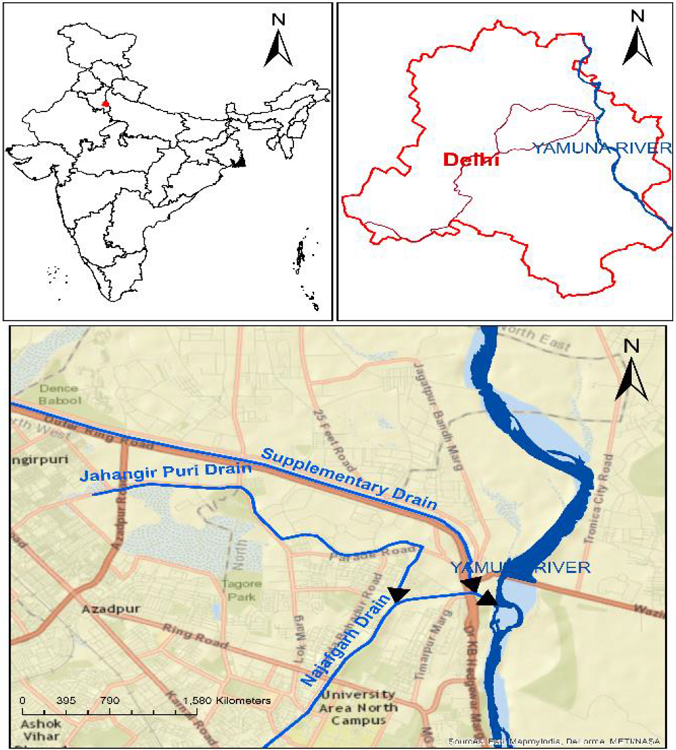 In the study área, Jahangirpuri drain, the drain under study, originates just before Azadpur road and carries the surface runoff from the nearby área like Model town, Azadpur, Gopalpur Village and Adarsh Nagar and outfalls into Najafgarh drain at Nehru Vihar as shown in Figure 1. Jahangirpuri drain is a natural stormwater drain which is maintained by Irrigation and Flood Control Department of National Capital Territory (NCT), Delhi. The drain is 5470 m in length and 18 m in bed width having a catchment área of 1619.43 hectares. The catchments área covers the área of Model town, Azadpur and Adarsh Nagar along with a waterbody on the right bank of the drain and Gopalpur Village área on the left bank of the drain.