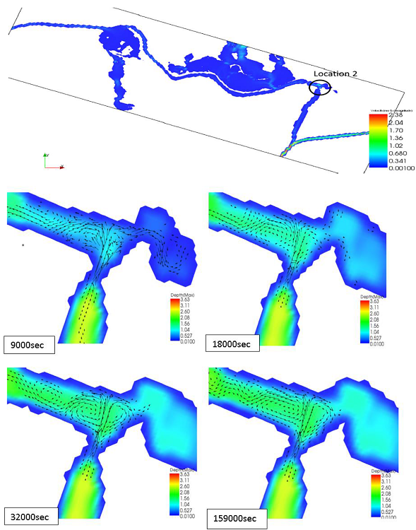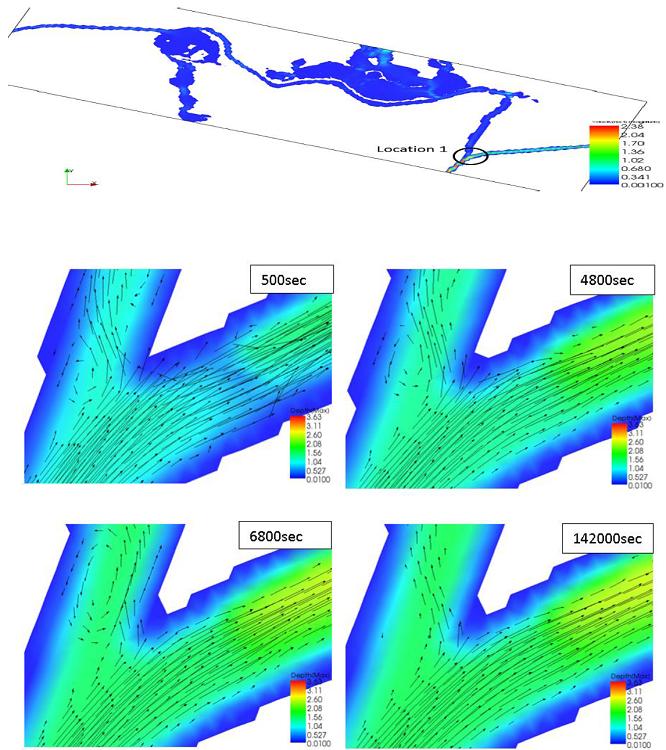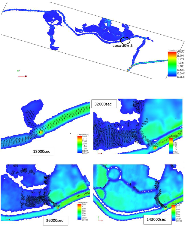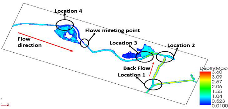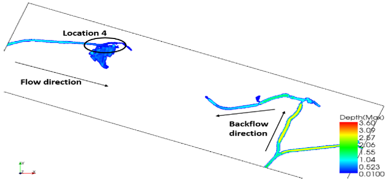 At 13000 sec, the backflow water starts flowing into the low-lying área at a velocity of 1.23 m/sec. After that at 32000 sec, the backflow water velocity is so high that it starts inundating the área at a fast rate as seen in the Figure 8, At 36000 sec simulation time, the upstream flow also starts contributing to this low-lying área at the velocity of 0.33 m/sec. And at 143000sec, the complete área is inundated by the flow and also the velocity get reduced.