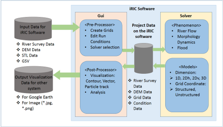 Kimura and Toshiki Iwasaka of Hokkaido University. iRIC offers a complete integrated framework where the generic information required by the solvers can be collected, modelling performed and simulated output be analysed. Figure 2, shows the general flowchart of the software procedure. The model solves the Saint-Venant equation which was derived from Navier-Stokes equations (2D) (Cook, 2008). In Cartesian co-ordinate system, the 2D unsteady flow equations i.e. continuity and momentum can be stated as (Jang & Shimizu, 2005; Wongsa, 2014).