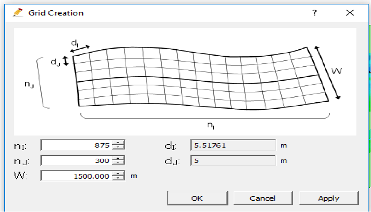 Then, number of divisions in the longitudinal direction is 875 whereas in the transverse direction is 300. The grid width in the transverse direction is 1500 m. The total grid created is 2,63,676 in numbers with each grid having a size of 5.51m x 5m (di x dj) as shown in Figure 3.