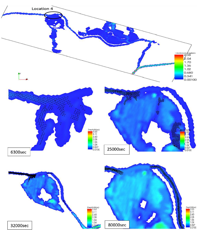 Figure 8, shows the velocity vector profile at location 4. The velocity at the start of the drain is around 0.66 m/sec. But the velocity increases to 0.96 m/sec when the flow reaches location 4. The increase in the velocity is due to the presence of waterbodies at low invert level with respect to the invert level of the drain. The velocity increases due to the sudden drop in the invert level. At 6300 sec, the velocity of flow is 0.96 m/sec when it starts contributing to the waterbodies. At 25000sec, the velocity in the drain reduces to 0.67 m/sec because at this time the level of waterbodies and the level of the drain is almost equal, thus the flow moves forward towards its outfall. The velocity is continuously decreasing over the time i.e. at 32000 sec the velocity is 0.476 m/sec and at 80000sec the velocity is 0.339 m/sec. The decrease in velocity is due to mínimum water level difference as the low level are already filled with water at this time. The flood extent is showing that after inundating the waterbody, the flow moves towards the Model Town and Azadpur área and inundated the complete área. Thus the developed Nay2Dflood solver model can be said as an effective tool for identifying the flood extent during heavy storm events.