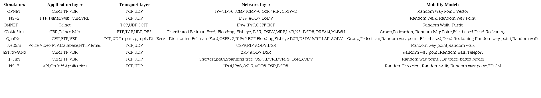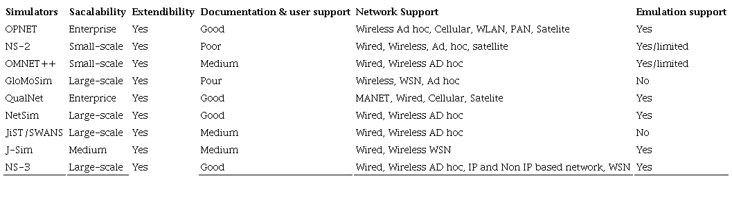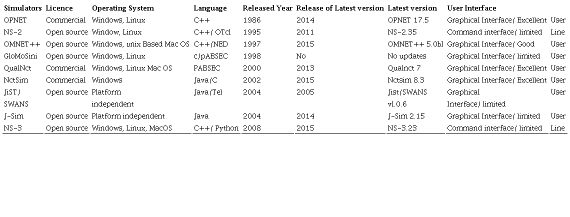 The comparison of various parameters of the simulators are summarised in Table 1. Simulators such asNS-2, NS-3, OMNET++, JiST/รพANS, J-Sim are open source network simulators while OPNETjGloMoSim and QualNet are commercial simulators. Open source simulators are available freely and can be downloaded from the official website at free of cost. Many researchers use open source simulators for their work. Latest and updated versions are released periodically or randomly for almost all the simulators except for GloMoSim and JiST/SWANS. OPNET, QualNet and NetSim provide excellent Graphical User Interface. Table 2 show the list of protocols and the mobility models supported by the network simulators. Almost all the network simulators support many protocols in the different layers of protocol stack. QualNet supports more number of mobility models than other simulators. Table 3 summarises the important features of the network simulators. Scalable simulators such as OPNET, GloMoSim, QualNet, NetSim, JiST/SWANS and NS-3 can be used for simulating large networks. For small network simulation other simulators can be used. When compared to open source simulators, documentation is good for commercial simulators. All the simulators have the feature of extendibility. GloMoSim and JiST/SWANS have no support for emulating real time networks while other simulators provide limited or good emulation support.