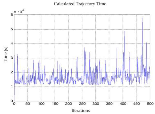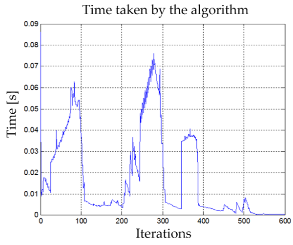 The maximum time taken by the algorithm to generate the route toward the objective is 0.180 seconds in the first iteration. Then, as the vehicle approaches the goal, the algorithm decreases its process time linearly, as shown in Figure 9.