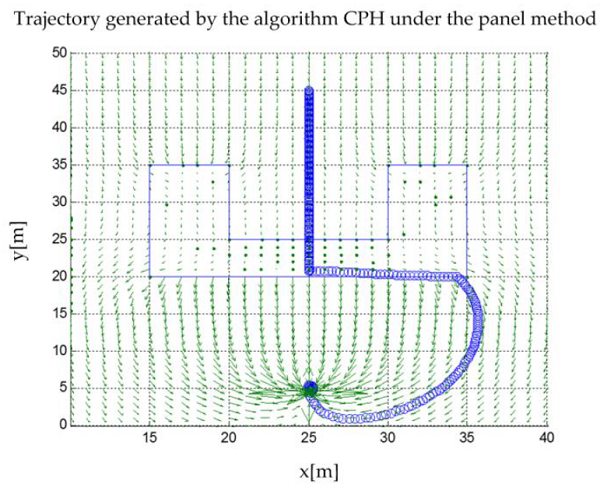 Figure 5 shows that the panel method is unable to solve the trajectory problem when faced with spatial configurations that generate a local minimum as strong as those formed by the U-shaped structures. In a more detailed way, Figure 6 shows the gradient of the generated harmonic potential.