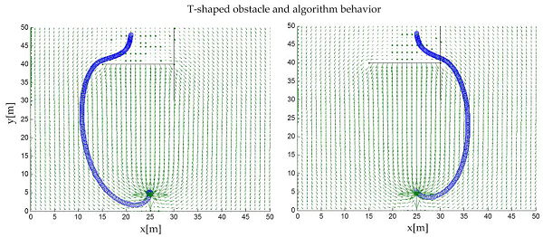 When developing a T-shaped structure, the harmonic potential field algorithm is capable of reaching the goal by evading part of the structure. Nevertheless, when having a look at the field flow, it is observed that the algorithm does not recognize the panel placed in a vertical position with respect to the x axis. creating the possibility of circulating and crossing that panel, i.e., the behavior of this algorithm with this kind of structures is not optimum. Furthermore, when different starting points are attempted, the algorithm diverges, thus confirming the previous idea, as schematized in Figure. 7.