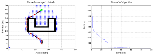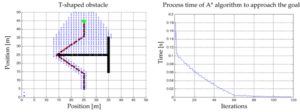 When the A* algorithm is exposed to a U-shaped structural obstacle, an absolute convergence from the starting point to the goal is seen, i.e., it is capable of recognizing the local minimum generated by the structure and developing a route that involves the smallest distance cost according to the stated heuristic. Figure 8 shows the evolution of the algorithm and the time that it takes to find the goal while the vehicle is in motion. In the following simulation it is seen that the maximum time taken by the algorithm to detect the goal is 0.16 seconds,