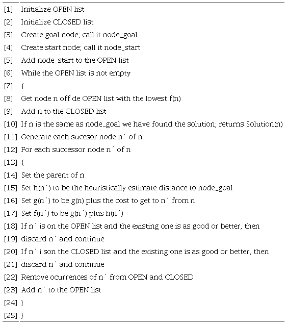 where α corresponds to a constant whose value fluctuates between 0 and 1, defined for the problem to be faced, which will determine the branching degree of the algorithm. In addition, g(x)n-1 represents the g(x) value of the previous parent node. The pseudocode that defines the A* algorithm is presented in Table 1 (Valenzuela. 2009).