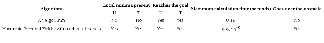 In Section 4 it was established that the harmonic potential field algorithm did not have a good behavior when faced with complex structures and non-point obstacles identified by the method of panels. In the บ-shaped obstacle, the potential gradient crossed the structure and provided the bottom part of the obstacle points to the objective, as shown in Figure 4. This algorithm was not able to distinguish clearly a structure orthogonal to the X axis, as it did not perform optimally when faced with non-point structures, as can be seen in Figure 7. However, the algorithm exhibited excellent performance in point obstacles located in an open space, i.e., without well-defined boundaries, completely converging with the goal. It must be pointed out that the time required by the harmonic potential field algorithm to generate the route is considerably shorter than that of its counterpart discussed in this paper.