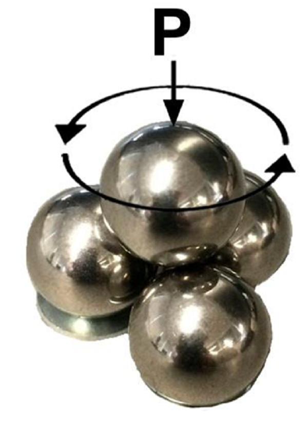 The conditions of this test are as follows: an upper ball rotates (See Figure 1) in a perpendicular axis with a speed of 500 rpm against three stationary balls covered with -10mL of lubricant, with a linearly increasing load of 0-7200 N at room temperature (25 ๐C), over the course of 18 s. The load increases until seizure occurs and the lubricant film is destroyed (at 10 N.m), this load is denoted as poz. If a torque of 10 N.m is not reached and no seizure occurs 7200 N is taken as Poz. For every test, the limiting pressure of seizure, Ροζ, is calculated with the following equation (Eq. 1) (Michalczewski et al., 2011):