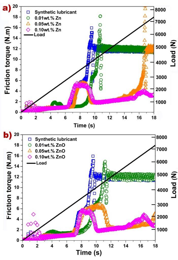 Figure 2 shows the friction torque at increasing load over time for Zn and ZnO nanolubricants. It can be observed that the unfilled synthetic lubricant presents seizure before the end of the run, at -3800N. The addition of both nanoparticles delayed seizure at 0.01wt, with loads of -4500N and -4800N for Zn and ZnO nanoparticles, respectively. Higher concentrations showed no lubricant seizure, thus a Pt of 7200N is taken, with the best performance provided by ZnO. This is due to the nanoparticle 'S higher hardness (4.5 Mohs) compared to Zn (2.5 Mohs) that allows for a higher load-carrying capacity. Pressure loss limit was then calculated considering the WSDs of the three lower balls of each test (Figure 3). A comparison between WSDs is shown for pure lubricant and 0.10wt.% ZnO nanolubricants (see Figure 4).