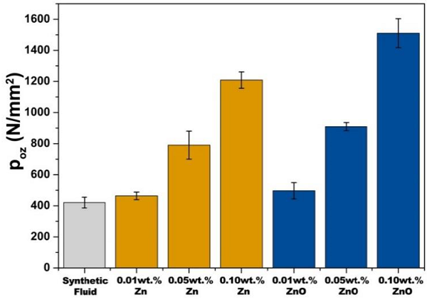 It is also observed that during the homogeneous dispersion process, a thin tribofilm of ZnO was formed within the fluid and components surfaces. The tribofilm between rubbing surfaces increase the load-carrying capacity of the lubricant:-This effect has been also observed by other authors. (Alves et al., 2016; Chen, Liu, Liu, Gunsel, & Luo, 2015; Peng, Chen, Kang, Chang, & Chang, 2010; Laura Peña-Parás et al., 2014) Chen et al. observed an enhancement on the non-seizure load of liquid paraffin due to the formation of a tribofilm (ultrathin MoS2 nanoparticles). (Chen et al., 2015) Similarly, ՏiՕ2 nanoparticles dispersed in liquid paraffin formed a tribofilm between rubbing surfaces increasing the load-carrying capacity of the lubricant. (Peng, Chen, et al.. 2010).