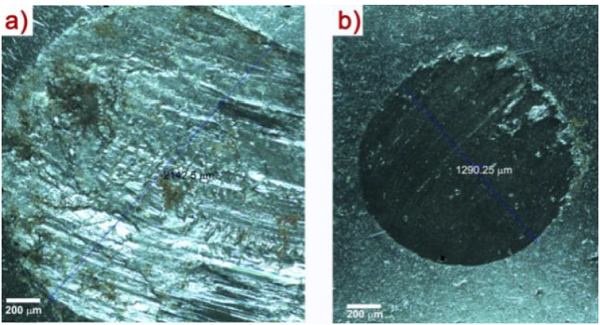 Surface roughness of wear scars of steel balls were characterized with an Alicona IF-EdgeMaster optical 3D surface measurement system. Energy Dispersive Spectroscopy (EDS) analysis was performed with a JEOL Scanning Electron Microscope (SEM) using 15kV and 10mm working distance. Three specimens were analyzed, finding a variation of 1 ֊ 2% among them, reporting the most representative value.