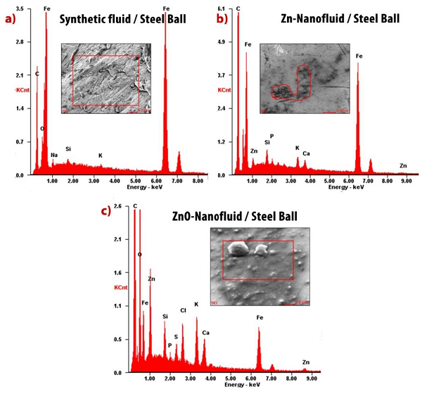 Figure 5 shows the EDS analysis of steel balls after tribological evaluation. The EDS spectrum and SEM image of a steel ball is presented in Figure 5a as a reference. EDS spectra in Figure 5b and Figure 5c reveal the presence of Zn on the worn surfaces tested with Zn and ZnO nanolubricants. Nanoparticle tribosinterization is also evident in the SEM insets for Figure 5b and Figure 5c, which formed a tribofilm. This tribofilm that prevented metal-metal contact between rubbing surfaces explains the increase in tribological and surface roughness properties shown in Figure 2, Figure 3, and Table 2. Additionally, the presence of residual elements like potassium (K) and calcium (Ca) are expected since potassium salicylate and calcium chloride are used as additives within conventional metal-mechanic lubricants (Brinksmeier, Meyer. Huesmann-Cordes, & Herrmann, 2015), US8299007 B2, 2010.