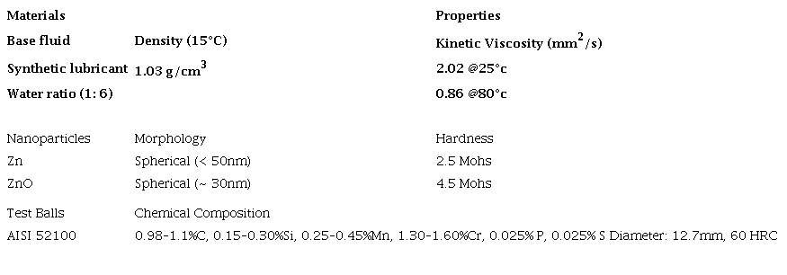 Zn and ZnO nanoparticles (described in Table 1) were homogeneously dispersed within synthetic lubricant at different concentrations: 0.01, 0.05 and 0.10wt.% for each material. Extended water bath sonication (~3֊4 h) was first used; the water bath was maintained at room temperature (25 °C) to avoid possible nanoparticles agglomeration. Subsequently, a Metason 120T bath sonicator (output power of 70W) was used, according to a previous study by our group. ( Jaime Taha-Tijerina et al.. 2012).