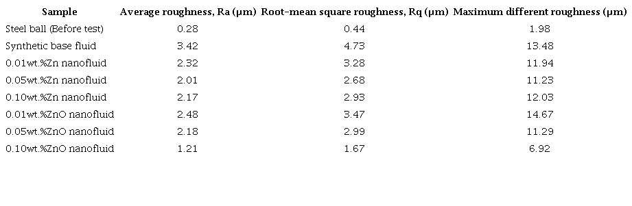 In our results high Ra, Rq, and Rz values are obtained for the worn surfaces due to the EPs of the test; a decrease in these values mean lower metal-metal contact due to the presence of the nanoparticle additives. The worn surface with the synthetic base fluid showed Ra of 3.42μm. The nanolubricant containing 0.05wt.% of Zn nanoparticles showed a decrease of 41%, compared to the synthetic fluid. Moreover, the nanolubricant with 0.10wt.% ZnO had the highest decrease in Ra of 65% due to a tribofilm formation, reducing the contact area between moving surfaces.