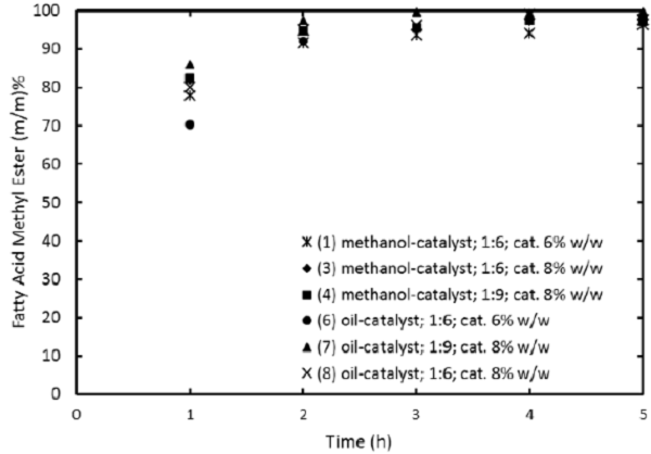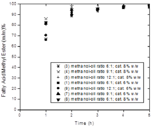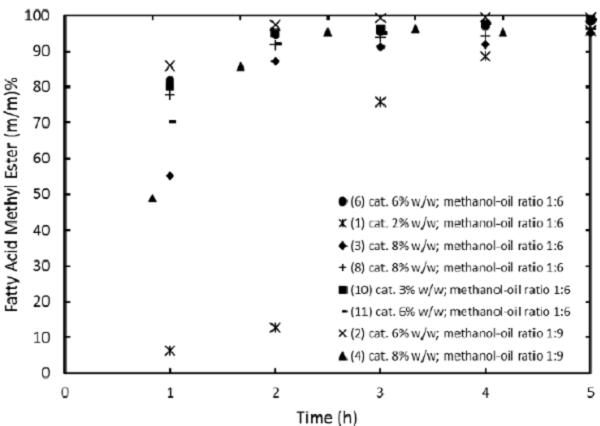 Figure 3 shows evidence of the importance of catalyst loading. It can be observed that increasing the catalyst loading increases reaction rate and with the lowest catalyst loading of 2% presents a sigmoidal profile. This can be ascribed to the lack of active sites to readily transesterify the canola oil.