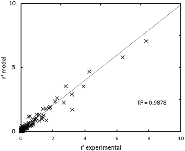 The r’ calculated with Equation 3 was plotted versus the r’ obtained from experimental data. This parity plot is shown in Figure 4.