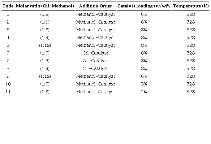When not being the variable under study, the stirring rate, methanol-oil molar ratio, catalyst loading, order of reagents addition, raw materials source and temperature were kept constant at all experiments. The stirring rate was 1000 rpm. Experiments were performed with a methanol-oil molar ratio of 6:1, 9:1 and 12:1.The studied catalyst loading was 2, 3, 6 and 8% (w/w) with respect to the reaction mixture weight, and the reaction time was 5 h at all experiments. The maximum reaction temperature was set at 328 K in order to reduce methanol evaporation without compromising much the energy provided to activate the catalyst and the reaction. It is worth pointing out that the boiling point of methanol is reduced at the atmospheric pressure (558 mmHg) of the place where this research was conducted. The reaction conditions for each experiment are summarized in Table 1. Each experiment was conducted by duplicate. Upon reaction completion, catalyst was separated from the products (glycerol and methyl esters) by centrifugation. Residual methanol was evaporated in a rotavapor (R-215 Buchi Switzerland) under vacuum.