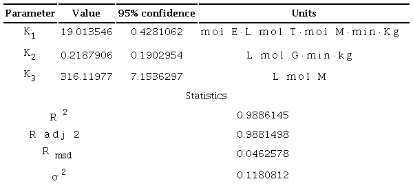 The aforementioned experimental data were used to test the models proposed in section 2.5 (Tables 2, 3, 4 and 5). Based on the estimated parameters, confidence intervals and regression coefficients for all models, it can be concluded that the model that best fits the experimental data is the one with the Eley-Rideal mechanism and surface reaction as determining step with the assumption of in accordance with section 2.5, i.e. glycerol adsorption is weak (Table 5). The Eley-Rideal kinetic model is consistent with the surface reaction step that becomes rate determining when a high basicity catalyst is used, such as BaO, CaO or SrO (Ilgen, 2012b). It can also be concluded that the LHHW mechanism based models fail to represent the experimental data. These models were found to be less precise, estimated parameters were negative and/or the confidence intervals were rather large. The ER model is shown in Equation 3 with its estimated parameters and statistics in Table 6.