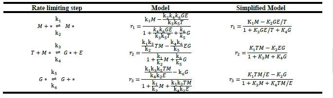 The ER mechanism based models assume the adsorption of methanol (M) on the catalytic surface and then the surface reaction between triglycerides (T) with adsorbed methanol (M) proceeds to form adsorbed glycerol (G) and free methyl esters (E). Finally, adsorbed glycerol is desorbed from the catalytic surface. All these steps are considered reversible. The rate determining elementary steps and the accordingly established models are presented in Table 3.