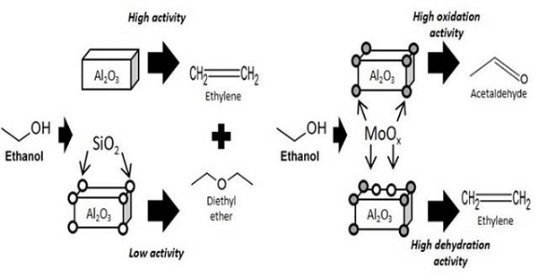 The transition alumina phase, γ-Al2O3, is a very important material used as adsorbent, catalyst and support in the petroleum and chemical industries (Busca, 2014). Alumina is widely used as support of numerous metallic, oxide and sulfide industrial catalysts. Recently, molybdenum catalysts supported on alumina (~12 wt%, ~200 m2/g)) have been used in the conversion of ethanol to acetaldehyde. (Balat, 2011; Limayem & Ricke, 2012). (Bio)ethylene (Mohsenzadeh, Zamani, & Taherzadeh, 2017) and diethyl ether can be obtained by the catalytic bio(ethanol) dehydration, typically obtained over acidic catalysts such as γ-Al2O3 (Phung, Proietti Hernández, Lagazzo, & Busca, 2015), while acetaldehyde can be the primary product of ethanol dehydrogenation or oxidative dehydrogenation. Pure and oxidative ethanol dehy-drogenation processes have been applied industrially in early times to produce acetaldehyde from ethanol over copper and silver catalysts, with high (but not complete) selectivity only at low conversions, thus with the recycling of unreacted ethanol (Chauvel & Lefebvre, 1989; Eckert, Fleischmann, Jira, Hermann, & Golka, 2006; Weissermel & Arpe, 2003) in detriment of the process economy.