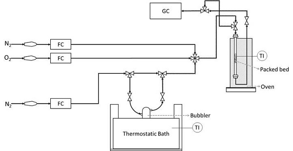 The catalytic experiments were performed at atmospheric pressure in a tubular flow reactor (i.d. 7 mm) using 0.50 g of catalyst (60-70 mesh, thus achieving a ratio between the particle and internal reactor diameter near 25) and feeding ethanol (96% assay, from Sigma Aldrich) in nitrogen with a total flow rate of 80 cc/min. For oxidation tests, the following gas composition and parameters have been used: 2.1% C2H6O, 14.8% O2, 83.1% N2 total flow 80 cc/min, catalyst weight 0.50 g. The carrier gas (N2) was passed through a bubbler containing ethanol maintained at constant temperature (298 K) to obtain the desired partial pressures. The temperature in the experiment was varied stepwise from 423 K to 773 K. In Figure 1 is showed the experimental set-up for testing catalytic performance.
