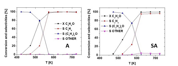 The conversion and selectivity in the ethanol conversion in absence of oxygen are shown in Fig. 10. As previously reported (Garbarino, Travi, Pani, Carnasciali, & Busca, 2015), the catalytic activity in terms of ethanol conversion of pure alumina is significantly higher than the one observed for SA. Both catalysts produce mainly diethylether at low temperature and low conversion, and ethylene at high temperature and high conversion, without acetaldehyde production. Selectivity to other products is very small (~0.3 %) for A, but significant for SA where, at high temperature and conversion, they are ~4.5 %, due to higher hydrocarbons, formed only at high temperature. These data confirm the high dehydration activity of these catalysts without any evident dehydrogenation activity.