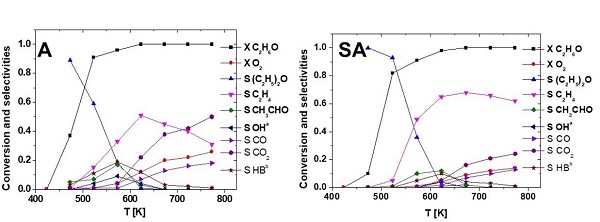 When oxygen is fed together with ethanol (Fig. 11, left), the conversion of ethanol on A is further increased, despite the lower concentration of ethanol in the feed. The selectivity towards diethyl ether and ethylene decreased because of the formation of several additional products, such as acetaldehyde, ethylacetate, and C4 hydrocarbons at partial conversion, CO and CO2 at very high or full conversion. However, acetaldehyde yield never exceeds 20 %, and ethylene remains the principal product in while at full conversion (where CO and CO2 are mostly produced). In these conditions oxygen conversion does not exceed 25 %, showing that the catalyst has very low oxidation activity. The low activity of pure alumina as an oxidation catalyst can be attributed to very small amounts of transition metal impurities (Finocchio et al., 1997). A similar behavior is found for SA (Fig. 11, right), which appears, however, to be less active than A in ethanol total oxidation at high temperature and less active in ethanol dehydration of diethylether, at low temperature, also in the presence of oxygen.