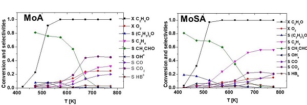 The effect of molybdenum addition on SA is a little different. In fact, in this case the conversion of ethanol is slightly increased at low temperature by the addition of molybdenum, producing acetaldehyde but also retaining significant activity in dehydration to diethyl ether. The selectivity and yield to acetaldehyde on MoSA is lower than on MoA, with residual activity in producing diethyl ether. At high temperature (above 623 K), the dehydration activity to ethylene is also definitely higher on MoSA than on MoA, while the oxidation activity (oxygen conversion, combustion activity) is lower on MoSA than on MoA.
