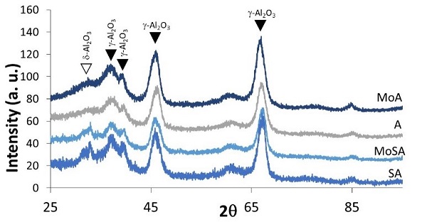The diffraction patterns of the molybdenum-containing samples do not show additional peaks besides those of the supports (Fig. 2). The characteristic peaks associated to molybdenum oxides have been not observed.