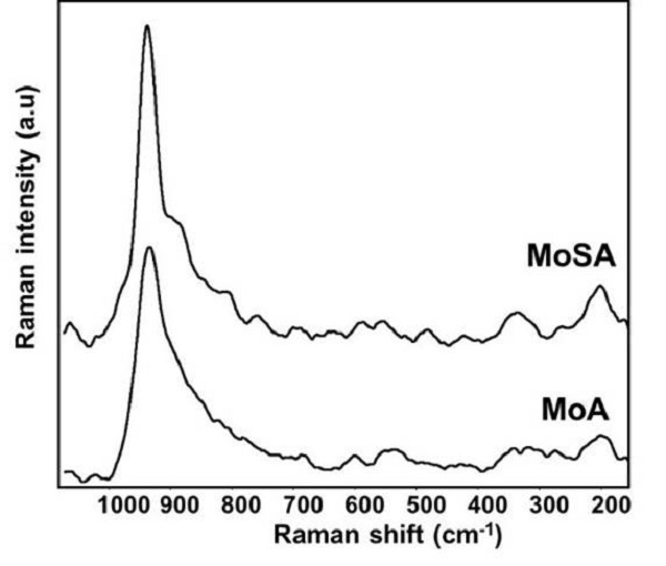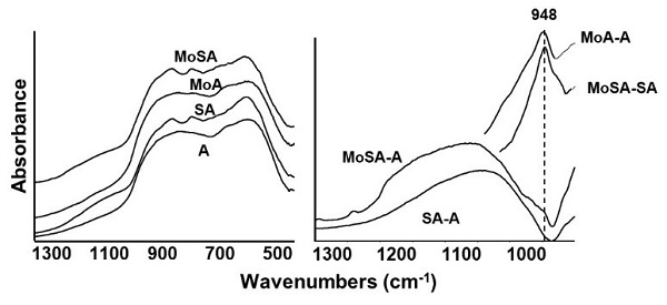 Subtracted skeletal IR spectra of both MoA and MoSA (i.e. the MoA-A and MoSA-SA subtractions, Fig. 3, right) show a band near 948 cm-1, assigned to Mo=O stretchings of molybdenyl bonds. Also, the Raman spectra of both Mo-containing catalysts, MoA and MoSA (recorded in wet conditions, i.e. without performing drying procedures, Fig. 4), show a strong band near 950 cm-1, assigned too to Mo=O stretchings of molybdenyl bonds.