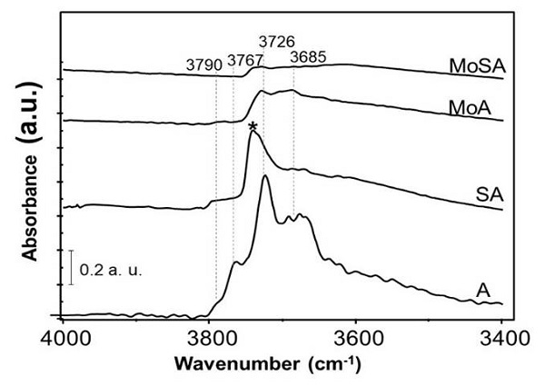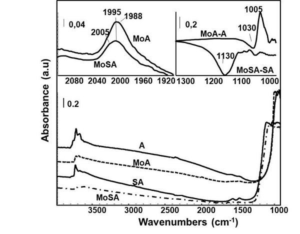 In the OH stretching region (Figure 5), the IR spectra of the MoA and MoSA, show a strongly decreased absorption with respect to the respective supports, with very weak residual bands due to Al-OH groups and Si-OH groups for MoSA. The total intensity in the region is even lower for MoSA than for MoA. This suggests that the effects of the addition of silicon and molybdenum to A on the Al-OH bands are similar, both species anchoring on the same alumina surface sites. The addition of molybdenum on SA further reduces the intensities of Al-OH bands, nearly completing the formation of a “mixed silicate-molybdate monolayer”. The characteristic band of silanol groups is also strongly reduced in intensity. The IR spectrum of the activated pressed disk (Fig. 7) of MoA shows a sharp absorption at 1005 cm-1, due to vMo=O stretching of surface anhydrous molybdenyl species (Busca, 2002; Hillerová et al., 1997), more evident in the MoA-A subtraction. The presence of vSi-O modes prevents the detection of vMo=O in the case of MoSA. The same spectra also show a weak absorption just below 2000 cm-1 (Fig. 7, up, left), due to the overtone of vMo=O. In the case of MoA, this band presents two superimposed components at 1995 and 1988 cm-1. For MoSA the band is at 1995 cm-1 with a quite prominent component near 2005 cm-1. For the position of the vMo=O, the stronger the ligands basicity, the lower vMo=O (Hillerová et al., 1997). Thus, part of the molybdenyl species in the case of MoA interacts with cation-anion centers of the alumina surface characterized by stronger acid-basicity. In contrast, on MoSA, more molybdenyl species interact with alumina sites characterized by lower acid-basicity.