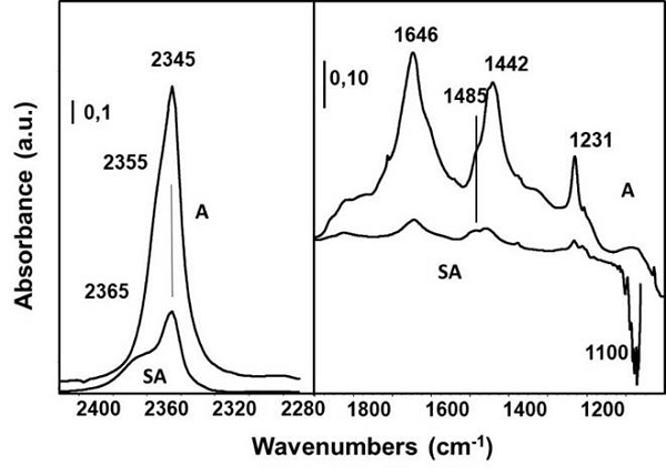 In Fig. 6, the spectra of the adsorbed species arising from CO2 adsorbed on activated A and SA samples are reported. The most intense band that arises at 2345 cm-1 with shoulders at higher frequencies (2355 and 2365 cm-1) is due to asymmetric stretching of CO2 molecules adsorbed linearly on Lewis acid sites. Also, several bands from slightly different surface hydrogencarbonate species arise at 1646, 1485, 1442 and 1231 cm-1 due to vasCOO, vsCOO and δOH vibrational modes (split vsCOO) (Busca & Lavalley, 1986). This shows that over activated A, acid-basic sites exist converting CO2 into hydrogencarbonate species. The bands of both CO2 and hydrogencarbonate species are weaker in the spectrum of SA than in A, showing that silicate species (at least part of which are in the form of hydrogensilicate ions HO-SiO3) “neutralize” in large part both, the strongest acid-base pairs and Lewis sites of the alumina surface. As discussed elsewhere (Busca, 2014), these sites are likely located on edges and corners of the alumina nanocrystals, thus this result let us to assume that silicate species depose primarily on edges and corners of alumina nanocrystals.