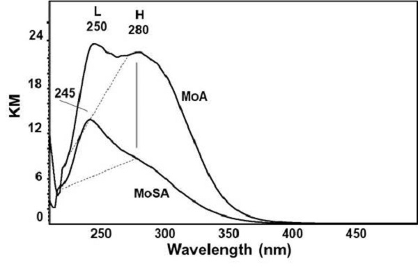 The UV spectra of MoSA and MoA (Fig. 8) show strong absorptions associated to O2- (2p) → Mo6+ (3d) charge transfer transitions (CTT). The UV-vis spectra recorded with the samples exposed to the ambient air and in dry atmosphere maintain the same features. Despite the same loading and nearly the same surface coverage (2.5-2.8 Mo at/nm2support, almost corresponding to half of a monolayer (Ramirez, Cedeño, & Busca, 1999; Sankaranarayanan et al., 2011; Tian & Wachs, 2010), the two spectra, composed by two absorptions, differ very much in total intensity and in shape. Absorption (H), at 280 nm is much stronger in the spectrum of MoA than in MoSA, while absorption (L), at 245 nm, is instead slightly stronger in the spectrum of MoSA than in that of MoA. Absorption (H) is attributed to species present in a relatively small amount but associated to a much higher extinction coefficient than absorption (L). Thus, the presence of silica in the support in some way limits the formation of species responsible for absorption (H), favoring the formation of species responsible for absorption (L).