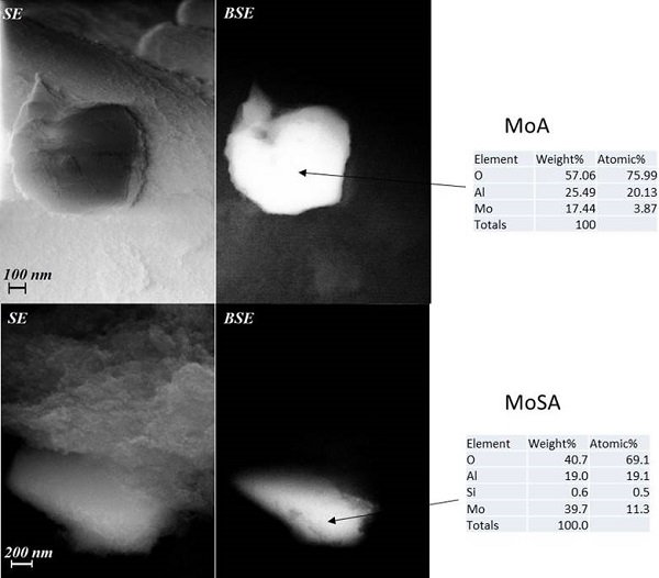 FE-SEM analyses using back-scattered electrons (BSE) (in Fig. 9 the micrographs of typical particles of MoA and MoSA are shown) indicate that molybdate species disperse on MoA and MoSA, while not forming MoO3 particles. Considering that molybdenum has a much larger backscattering coefficient due to its higher atomic number than the other elements present on the samples, bulk Mo oxide particles, if any, are expected to show a strong brightness. FE- SEM experiments do not show very bright particles with very high molybdenum concentrations, thus excluding the formation of separate molybdenum oxides particles, in agreement with XRD and IR and Raman skeletal data. Our samples show quite homogenous brightness in the particles, due to a dispersion of molybdenum over the support surfaces. However, the EDX analysis from FESEM images show that on MoA molybdenum species tend to cover the entire particles with quite homogeneous concentrations (Mo 5-20 wt%) while on MoSA Mo species seem to be less homogenously distributed with zones of higher Mo concentrations (30-40 wt%).
