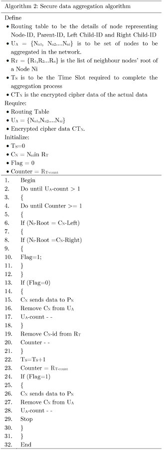 In this proposed system, the collision-free data aggregation algorithm will be executed by all the nodes in the network. Initially, this algorithm requires the routing table (generated by Algorithm 1), encrypted data and the list of nodes UA={Nn1, Nn2...Nni} to be aggregated in the network. The time slot TS is the time required by the sink node to aggregate data from all the nodes; TS will be initiated to zero. First, the algorithm verifies whether the node is a leaf node or not. If the node Ni is a leaf node, as well as a left node for another parent node, it will send the data to its parent node during the first time slot. Then, the node Ni will be removed from the set UA. In turn, the node, which is a leaf node, as well as a right node for another parent node, will send the data to its parent node during the second time slot. This node will also be removed from the UA. This aggregation process will be continued until all the nodes are removed from the UA. Once all the data are aggregated by the sink node, the value of TS is the time required by the algorithm to aggregate the data from all the nodes.