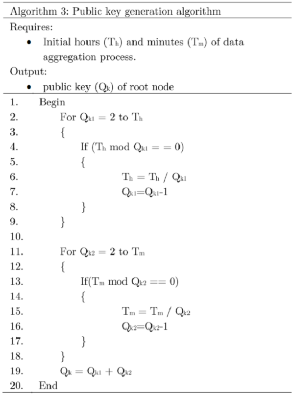 This third phase of the proposed HCED algorithm describes the encryption and decryption algorithm used to provide secure data aggregation. After completion of the data aggregation tree construction process by Algorithm 1, the public key generation algorithm (Algorithm 3) will be executed by the root node as an initial process of data aggregation. In Algorithm 3, the initial hour (Th) and minutes (Tm) of the data aggregation process are the key factors. By performing the mathematical calculation on Th and Tm, Algorithm 3 finds the public key Qk for a single-time data aggregation process. Whenever the data aggregation process is initiated by the root node, it generates a new public key Qk and broadcasts it among the network through a data aggregation request.