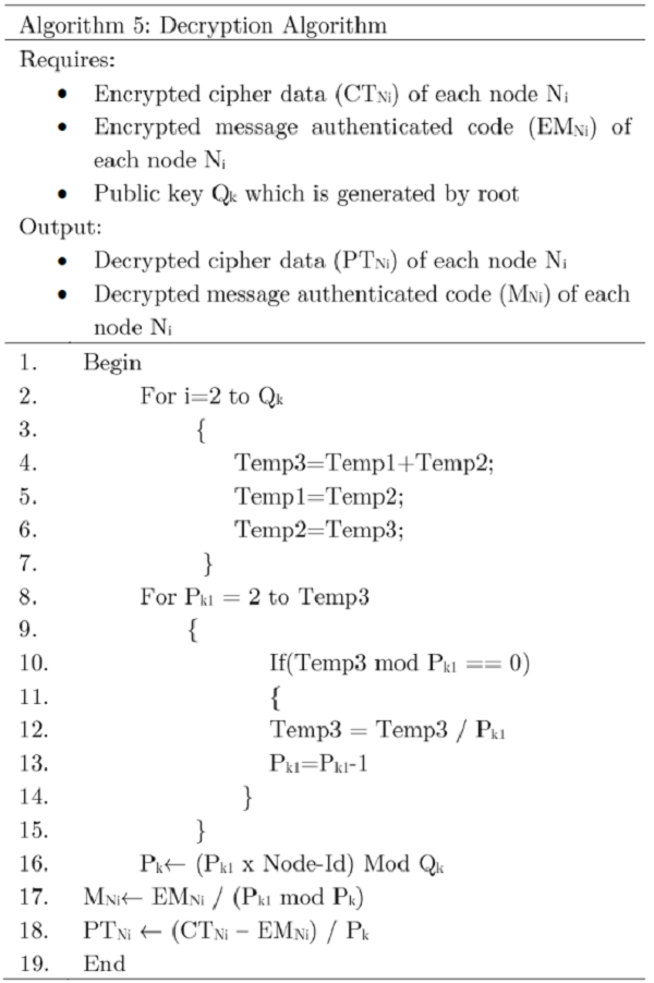 When the sink node has aggregated all the data from the network, it begins the decryption process by executing Algorithm 5. Each node’s ID is the key factor in the decryption algorithm. Since the sink node has the public key Qk, it needs to find the private key Pk. Lines 2 to 16 in Algorithm 5 find the private key Pki of each node Ni. With the help of Qk and Pki, lines 17 and 18 decrypt EMNi and CTNi to find MNi and PTNi of the node Ni.