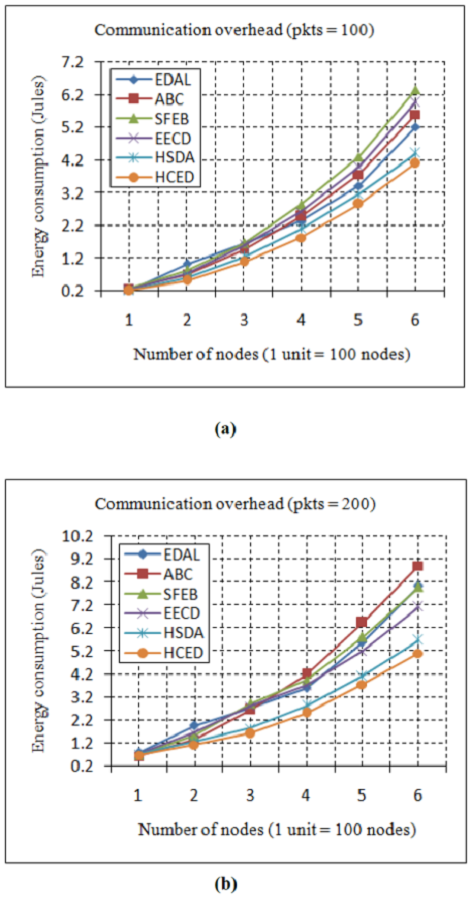 The communicational overhead of a network describes the collision problem in the network. The HCED approach is a unique solution that resolves maximum issues including collision. Here, the simulation has been carried out in order to evaluate the collision in terms of energy. The simulation model initially consists of 100 nodes, while the simulation is continued until up to 100 packets are received. Figure 3(a) represents the additional average energy required by the sensor nodes when aggregating the 100 packets. The HCED approach saves a minimum of 3.5% more energy than other models regarding the communicational overhead when the number of nodes is 100. It also saves a minimum of 7.3% more energy when the number of nodes is 600. Figure 3(b) represents the additional average energy required by the sensor nodes when aggregating the 600 packets. The two-hop tree-based data aggregation resolves the collision problem, meaning that the proposed model reduces the communicational overhead.
