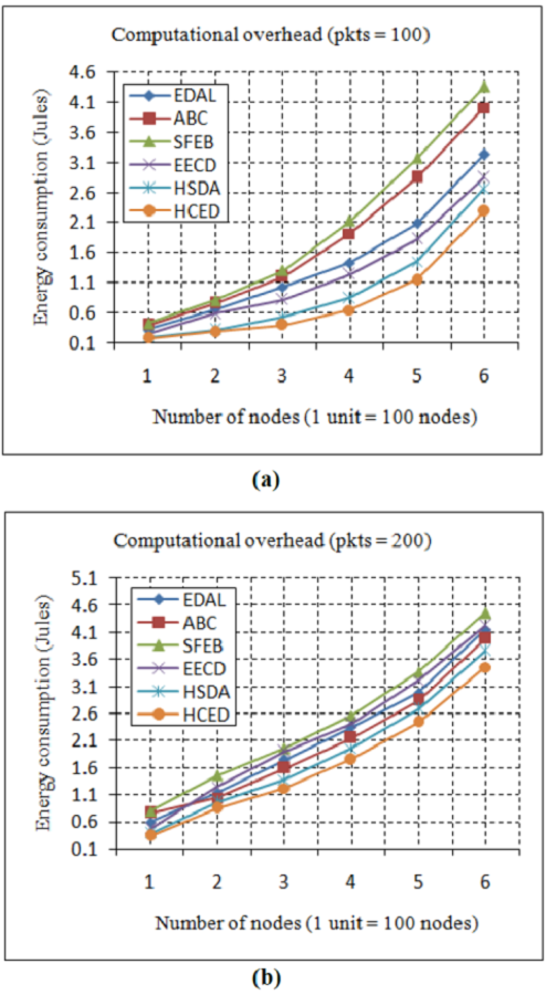 The additional energy required by a sensor node to execute the algorithms in a data aggregation model can be represented as computational energy. This computational overhead will be analyzed in relation to the proposed model in two cases. Case 1 will be evaluated until up to 100 packets are received from 100 to 600 nodes. The computational overhead comparison for the Case 1 will be described in Figure 4(a). Case 2 will be evaluated until up to 200 packets are received from 100 to 600 nodes. Figure 4(b) describes the computational overhead of the proposed model. When 100 packets are aggregating from 100 nodes, the proposed model reduces the computational overhead between 11% and 90% more than other models. When receiving the 200 packets, the HCED approach will save between 14% and 29% more energy than other models. When compared to all the other models, the proposed model will have less computational energy due to the simplified algorithms used for data aggregation and tree construction.
