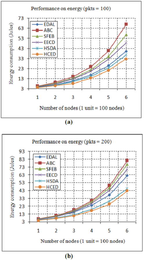 Two simulation scenarios have been considered in order to evaluate HCED performance regarding energy. In the first scenario, the number of nodes varies between 100 and 600 in increments of 100 nodes. The simulation was continued until 100 packets of data were received, after which the average energy consumption was evaluated to aggregate 100 packets. Based on the energy consumption, the results were compared with other models and are described in Figure 5(a). From the simulation results, it can be seen that the collision-free binary tree-based data aggregation model in the HCED approach reduces a minimum of 2.4% less energy consumption than the HSDA and a maximum of 36% less energy consumption than the ABC model when the number of nodes is 100. When increasing the number of nodes up to 600, the resultant energy consumption of the HCED approach is 11% less than the HSDA and 104% less than the ABC model.