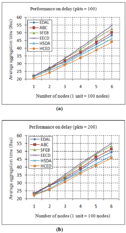 Delay can be represented as the number of seconds required to aggregate the data from all the nodes in a network. The delay performance of the proposed model was evaluated and analyzed by comparing it with other models in Figure6. By varying the number of nodes from 100 to 600 and aggregating the 100 packets of data, the average delay was calculated and analyzed with other models in Figure 6(a). When aggregating 100 packets from 100 nodes, the HCED approach reduces the delay by a further 1.7% to 6.3% compared with other models. When there are 600 nodes, the HCED approach reduces the overall delay by 3.4% to 20% compared with other models. Figure 6(b) presents a detailed comparison regarding delay when aggregating 200 packets.