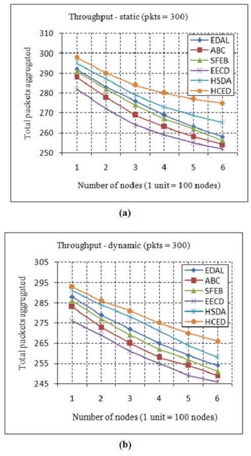 The throughput of an HCED approach has been evaluated in two cases. In the first case, the throughput has been calculated by varying the number of nodes from 100 to 600, in increments of 100 nodes, on the static network where the node positions are fixed. When it is assumed that the sink node needs to aggregate 300 packets from the network, the simulation results in this case show that the static network with 100 nodes achieves a 99.3% throughput, which is 1% to 5% higher than existing models. When the number of nodes is increased to 600, the network achieves a 91.6% throughput, which is 3% to 9% higher than all existing models. Figure 7(a) shows the throughput performance of the HCDA regarding a static WSN. In the second case, the throughput performance of the proposed model has been evaluated in a dynamic network, in which all the nodes have mobility. When the number of nodes is 100, the proposed model achieves a 97.6% throughput, whereas it achieves 86.66% when the number of nodes is 600. In conclusion of this case, the HCDA has been shown to work well in dynamic environments, showing 3% to 8% improvement in throughput compared with existing models. Figure 7(b) describes the throughput analysis of a dynamic network with existing models.