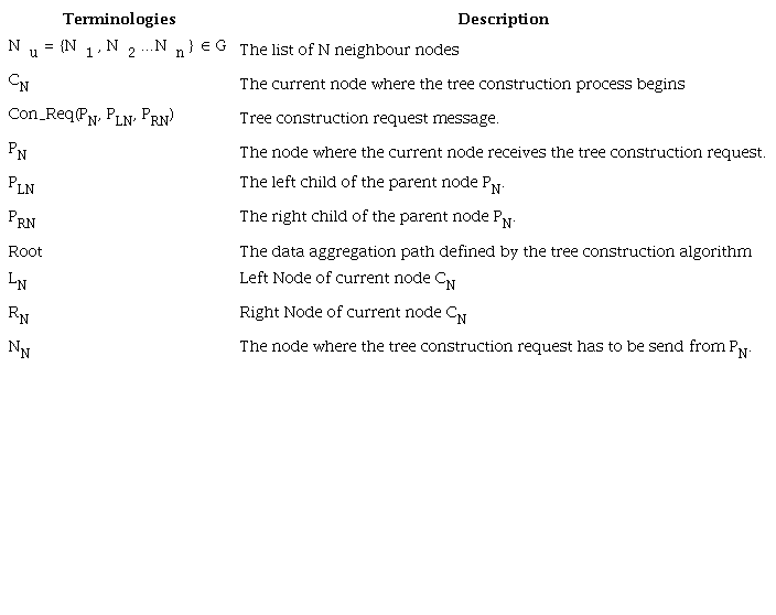 The hybrid communication for the energy-efficient data aggregation algorithm consists of three phases: i) energy-efficient aggregation tree construction, ii) a collision-free data aggregation algorithm, and iii) an encryption and decryption algorithm for secure data aggregation. Table 1 represents the terminologies used in the proposed algorithms.