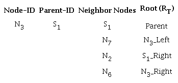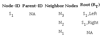 Initially, Algorithm 1 is executed by the sink node S1 with Con_Req (PN, PLN, PRN). Since the current node CN is the sink node, the condition from lines 4 to 8 will not be true. As such, the Node_Msg will be broadcast at line 9. The neighbor nodes will be identified based on the responses to the Node_Msg request. Based on the response time of the neighbor nodes, Algorithm 1 arranges the neighbor nodes in a sequence. The sink S1 identifies as its neighbor set. Lines 15 to 18 identify whether the neighbor nodes are associated with other parents or not. If the first neighbor node does not have a parent node, lines 21 to 23 identify the left child, while lines 26 to 36 identify the right child. Here, S1 identifies N3 and N2 as the left and the right child, respectively. Then, S1 sends the Con_Req (PN, PLN, PRN) to the left root N3. Table 2 represents the routing table for the sink S1.