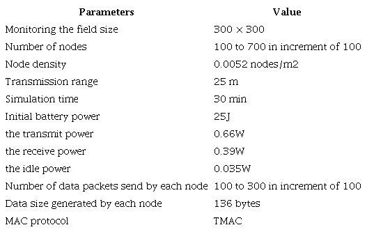By varying the number of nodes from 100 to 600, the simulation scenarios have been changed to evaluate the performance of the proposed model in all the parameters, such as collision, delay, throughput and energy. For all simulation scenarios, only one node was selected as a sink node, which has high residual energy and is attached to a gateway. The sink is located anywhere in surveillance area. All the nodes in the network generate a broadcast reply with the size of 64 bytes. Each source generates random data reports with the size of 136 bytes when it senses data with a constant bit rate of one packet per second.