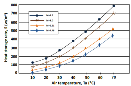 Fig. 2, for different ambient temperatures, shows the heat storage rate that needs to be eliminated from the human body to reach thermal energy balance. Thermal energy balance that is given when the heat storage rate in the human body is equal to zero, (S = 0), will be referred as thermal comfort in this study. The curves of Fig. 2 were obtained by using eq. (1) and the parameters given in Table 1, Table 2 and Table 3. As expected, from Fig. 2 it is observed that as the temperature increases, the heat storage rate in the human body increases, and more heat needs to be eliminated from the body to reach thermal comfort. In addition, as the metabolic rate increases, more heat is stored in the body.