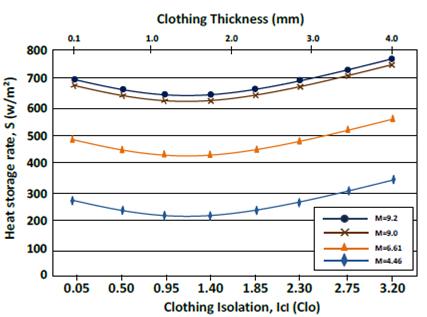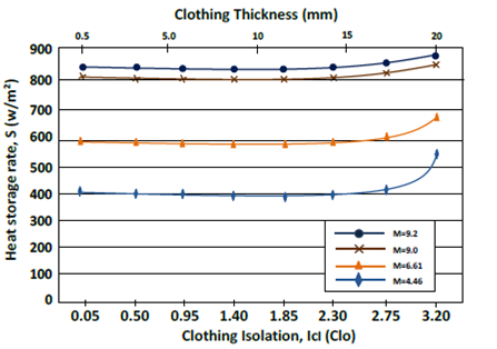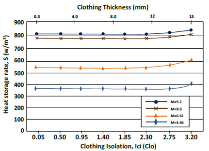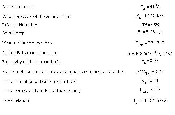 where h(m) is the garment thickness given in meters. In addition, from the norm ISO8996 [14], we used four standardized values of metabolic rate. The four considered values of metabolic rate and their associated physical activities are: M=9.2 met for heavy construction, M = 9 met for gardening, M=6.61 met for medium weight construction and M=4.46 met for light weight construction.