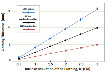 As expected, from Fig. 6 it is observed that intrinsic insulation of the clothing increases when clothing thickness is increased. It is seen that 100% regenerated bamboo can reach isolation values using smaller clothing thickness that 100% cotton and 50:50% regenerated bamboo: cotton. For example, 3 clo of isolation can be given by a 100% regerated bamboo garment with a thickness of 3 mm, while a garment of 100% cotton and 50:50% regenerated bamboo cotton need 5.9 mm and 9.6 mm of thickness, respectively. Hence, to reach intrinsic insulation of the clothing of 3clo, the garment thickness needed by using 100% regenerated bamboo is more than three times smaller as compared to 100% Cotton, and more than two times smaller as compared to 50:50% regenerated bamboo: cotton.
