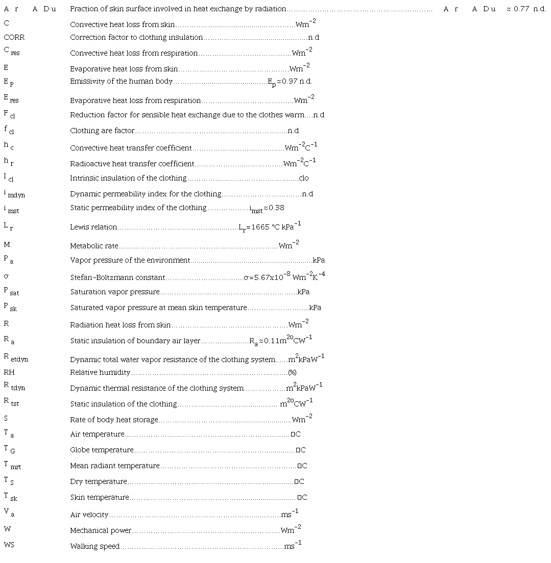 In eq. (17) the dynamic permeability index for the clothing is given by . The conduction K is usually very small, relative to other terms, and can safety be neglected.